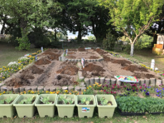 4月29日(日) ひまわりの背比べの準備が完了しました。あとは、3年生の子供達が、種を蒔くのを待つばかりです。深さ40cmの穴を掘り、堆肥を入れて混ぜ、埋め戻しました。少し日当たりが悪いのが気になりますが、今年は昨年度のリベンジで4mに再挑戦です。