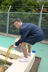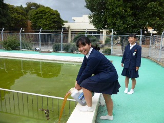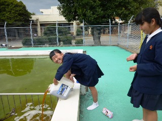 10月19日(金) 今日の業間に、保健委員がプールにEM液をまいてくれました。来年度のプール掃除がしやすくするのが目的ですが、保健委員の皆さん大変ありがとうございました。