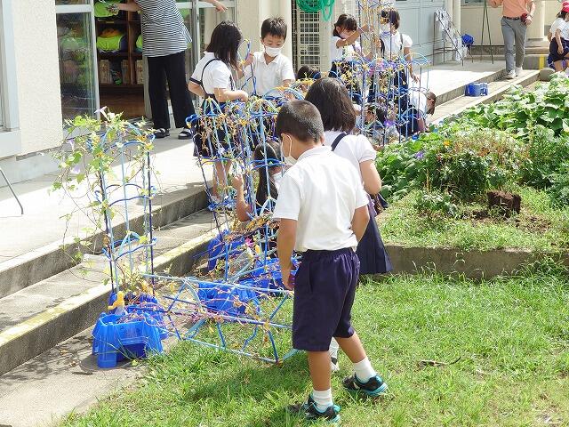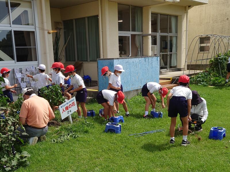 9月7日、急遽ミニ愛校作業をしました。台風11号に備えて屋内に移動していた鉢や掃除道具などをもとの場所に戻したり、落ち葉や枝を回収したりしました。全校児童で作業内容を分担して行い、25分間の活動でした。