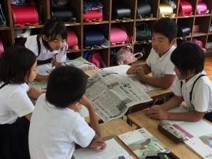6月9日(金)3時間目 4年生国語「新聞を作ろう」の1場面です。子ども達は、自然な形で対話ができていました。身を乗り出して、資料を指し示したり、自分の意見を述べたり活発な活動が行われていました。次期学習指導要領で示されている「主体的、対話的で深い学び」につながる姿の一つではないかと思います。