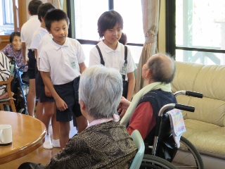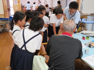 10月11日(水) 2・3校時 4年生が、「てんすい倶楽部」を訪問しました。4年生は、探究で「生き生きとくらせる福祉のまち たまな」の学習をしてきました。これまでに、アイマスク体験や高齢者疑似体験をしてきました。また、国語の「誰もが関わり合えるように」の学習でも、福祉やユニバーサルデザインについて調べて発表をしてきました。これらの学習のまとめとして、計画された交流計画です。利用者の方に喜んでもらえるように、また、相手の立場に立って考え考動することができるようになることをねらっています。まさしく玉水小で育てたい力の一つ「共感力」そのものです。写真は、その交流の様子です。