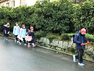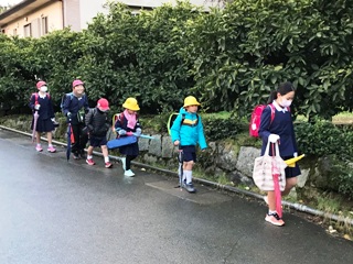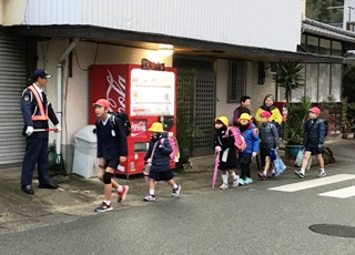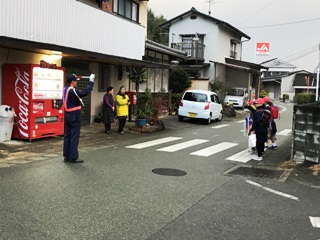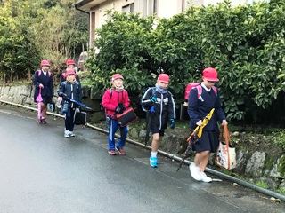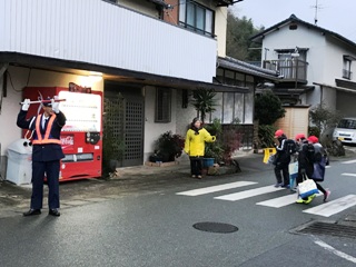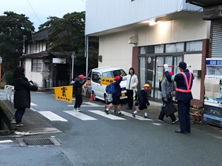 1月10日(水) 南坂下の登校の様子です。寒い中、子どもたちは、元気に登校しています。ちらほら、遅れてきている子どももいます。集合時刻を守って登校できるよう頑張りましょう。南坂では、主任児童員さんに登校指導をしていただいています。