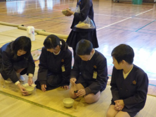 2月16日(金)34校時 玉名学で456年生が、茶道体験を行いました。天水中の鞆田先生の指導の下、貴重な体験ができました。