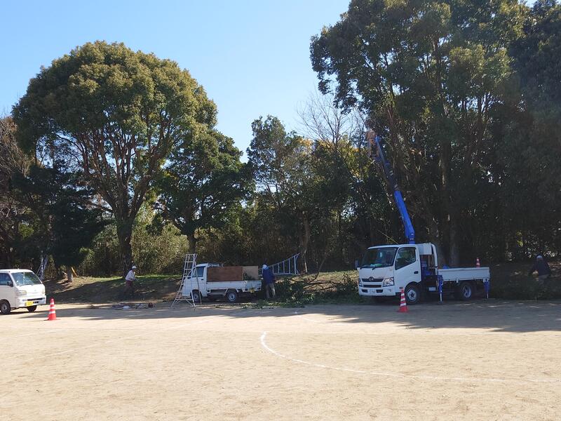 3月6日、運動場周縁に茂っている高木の枝打ちをシルバー人材の方にしていただきました。