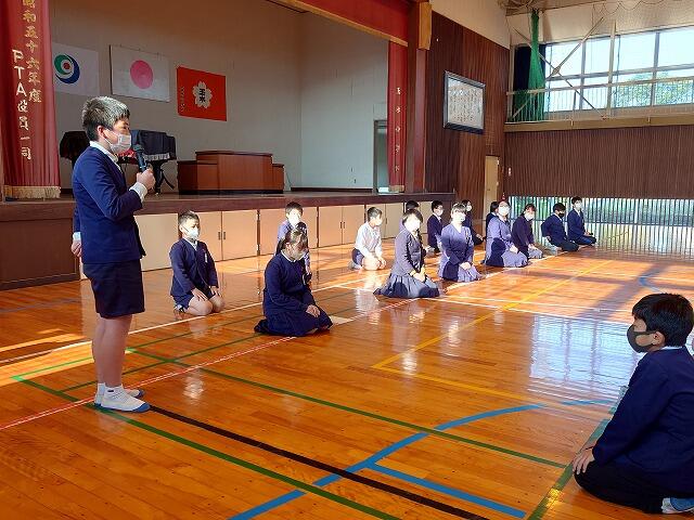 3月2日、卒業式全体練習を行いました。この日はまず、卒業式への心構えや卒業式のとらえ方を6年生に話しました。そのあと、姿勢や礼、椅子の座り方を練習しました。