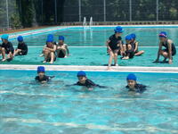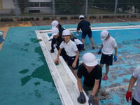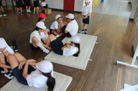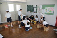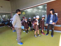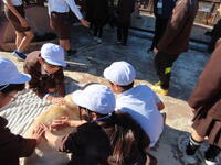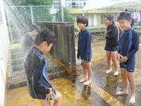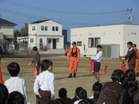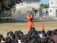 そして、落ち着て、全員が避難することができました。消防署の方からもスムーズに避難ができたと講評をいただきました。その後、消火器の使い方も指導していただき、6年生が代表で消火訓練を行いました。