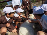 ミルク牧場では、まず、動物とふれあいました。大型の犬とは、最初は慣れてない子供たちも少しずつ慣れ、触れ合っていました。