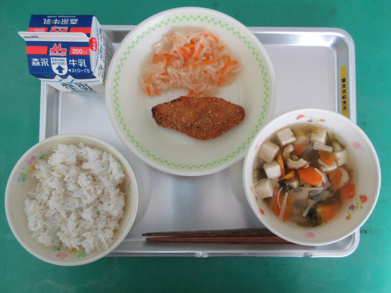 今日の献立は、麦ご飯、牛乳、あおさ汁、アジフライ、大根のゆずなますでした。