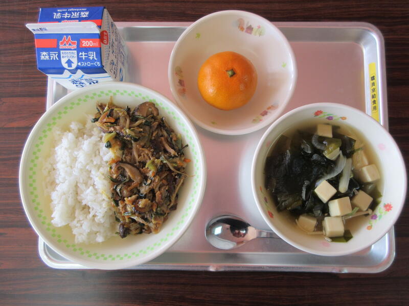 今日の献立は、麦ご飯、牛乳、わかめスープ、ビビンバ、みかんでした。