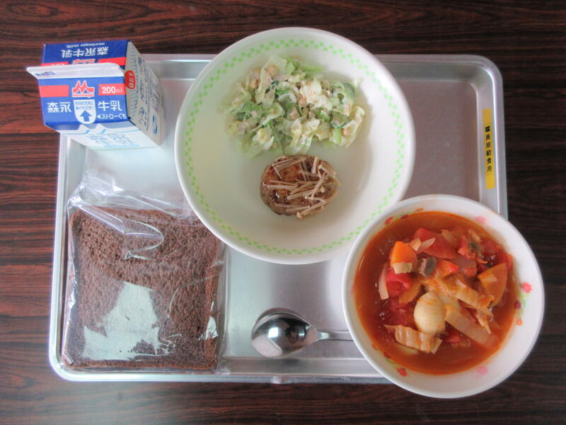 今日の献立は、ココアパン、牛乳、ミネストローネ、ハンバーグの生姜ソースがけ、ビーンズサラダでした。