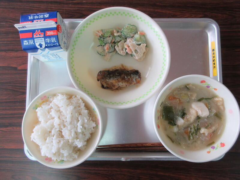 今日の献立は、麦ご飯、牛乳、すいとん入り根菜みそ汁、いわしの梅煮、れんこんサラダでした。