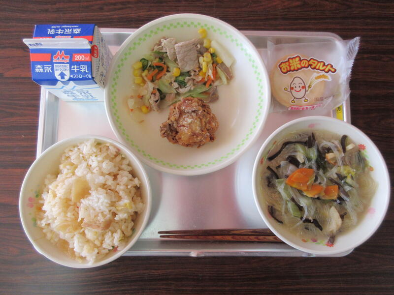 今日の献立は、キムタクご飯、タイピーエン、鶏のから揚げ、スタミナサラダ、お米のタルトでした。