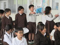 その後は、全校でレクリエーションをしました。どちらが好きかというお題に対して、他学年とペアを組み、自分が好きな理由を互いにお話をしました。