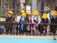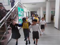 火災の場合の避難訓練を消防署の方々を招いて行いました。今回は、家庭科室から火災が発生した想定で避難しました。