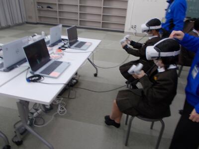 授業の中では、地球温暖化を防ぐための森林を役割や森林を守るための取組について教えていただきました。また、森林管理(木の間伐)のVRを全員が体験をし、楽しみながら自然環境を守る意識を高めていました。