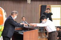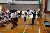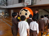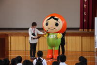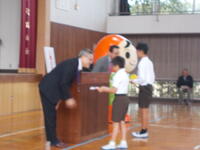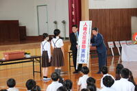 今年度、大野小では人権の花運動に取り組みました。人権マスコットのまもるくんも参加して、その終了式を行いました。まず、これまでの取組への感謝状や記念品をいただきました。