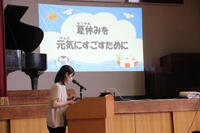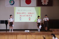 みんなが毎日元気に過ごすための大切な「早寝・早起き・朝ご飯」についての内容で、学校で行っている「すこやかチェック」の目的についても「自分の生活リズムを知って、よいところは続けて、直した方がよいところは、生活リズムが整うように自分で工夫をしてほしい」と発表してくれました。