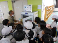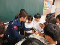 そして、落ち着て、全員が避難することができました。消防署の方からもスムーズに避難ができたと講評をいただきました。その後、消火器の使い方も指導していただき、6年生が代表で消火訓練を行いました。