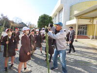 そして、落ち着て、全員が避難することができました。消防署の方からもスムーズに避難ができたと講評をいただきました。その後、消火器の使い方も指導していただき、6年生が代表で消火訓練を行いました。