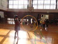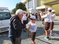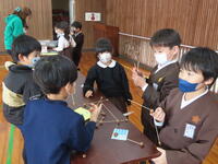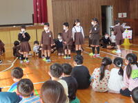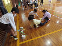 1・2年生が、大野保育園と岱明幼稚園の年長さんを招いて、おもちゃ祭りを開きました。これまで、1年生がどんぐり等の木の実を使ったおもちゃを、2年生がゴムやペットボトル等の身近なものを使ったおもちゃを作って、園児たちを楽しませようと準備してきました。