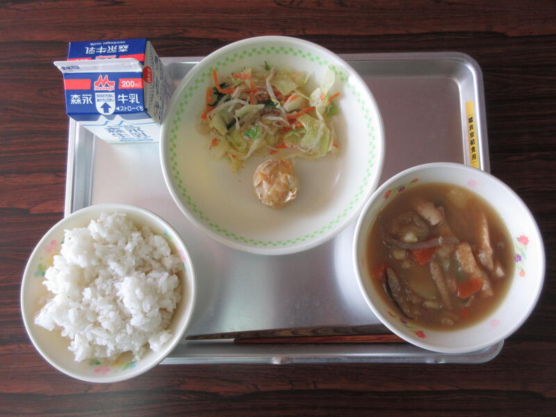 今日の献立は、麦ご飯、牛乳、けんちん汁、なすの挽肉炒め、きゅうりの南蛮あえでした。