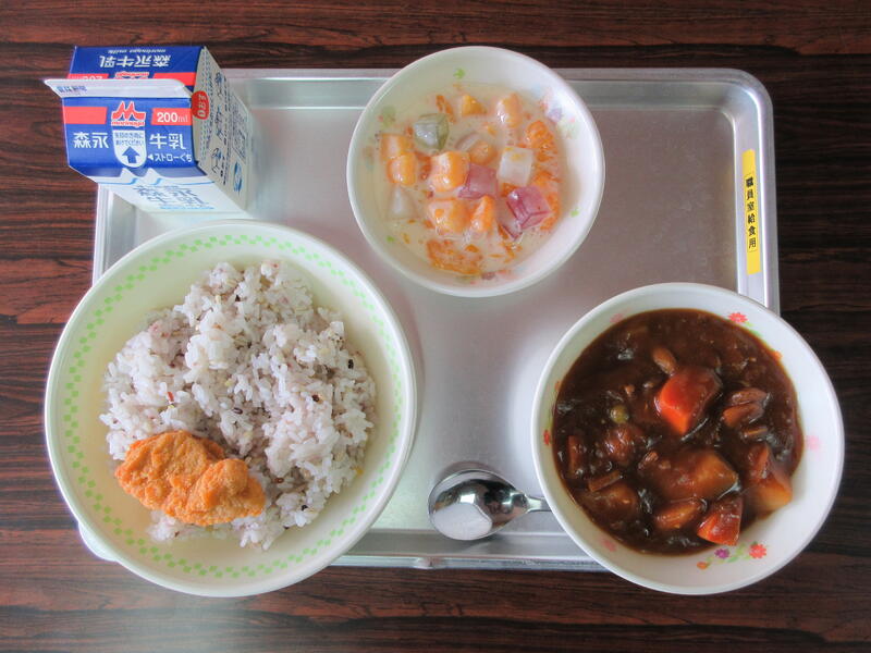 今日の献立は、雑穀米、牛乳、カレー、豚ヒレカツ、海藻サラダでした。