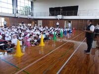 まず、体育館ではじめの会があり、代表の児童の目標発表、プールでの約束ごと、準備運動が行われ、その後、プールに向かいました。
