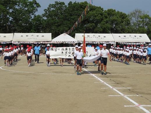 大野小の運動場に「いい声 いい顔 いい心」の子供たちでいっぱいでした。