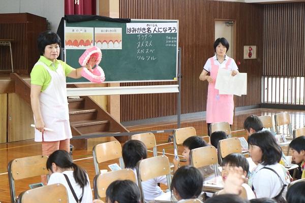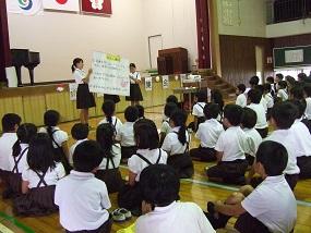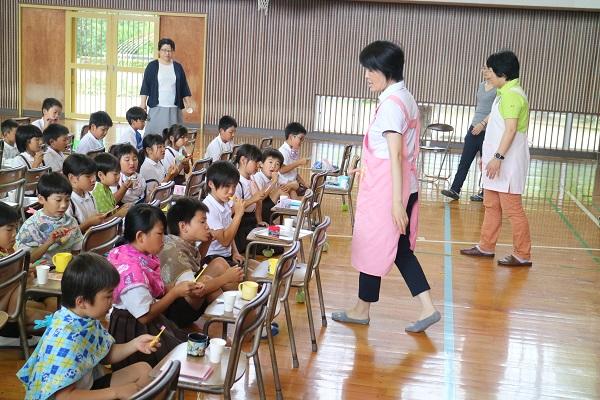 最後に、給食にかかわる多くの人々の思いを語られました。子どもたちは、真剣な表情で栄養教諭の先生の話を聞いていました。