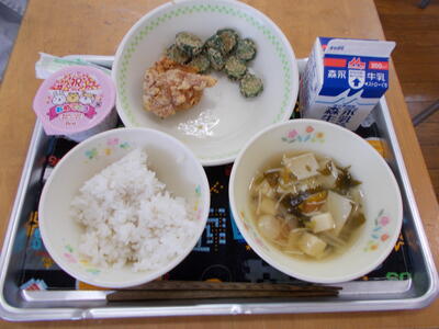 メニューは、キムタクご飯、ふしそうめん汁、からあげ、ごまきゅうり、果肉入りゼリー、牛乳と、ボリューム満点でした。子供たちからも「おいしかった」という声が聞かれ、大満足の様子でした。