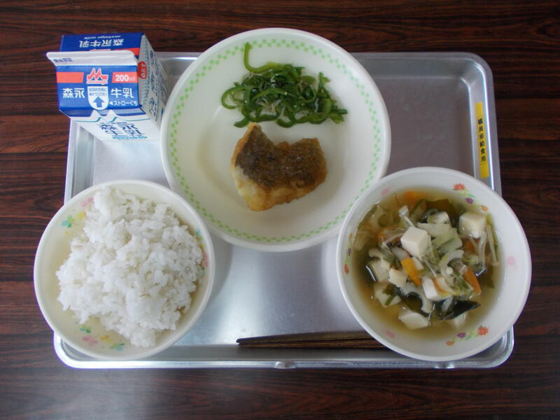 今日の献立は、麦ご飯、牛乳、豆腐のすまし汁、魚のバーベキューソース、ピーマンのじゃこあえでした