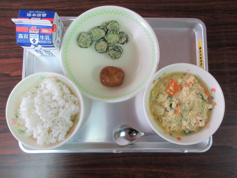 今日の献立は、麦ご飯、牛乳、南関揚げの卵とじ、れんこんつくね、ごまきゅうりでした。