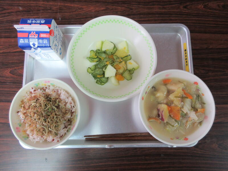 今日の献立は、古代米ご飯、牛乳、お姫さん団子汁、手作りふりかけ、菜果なますでした。