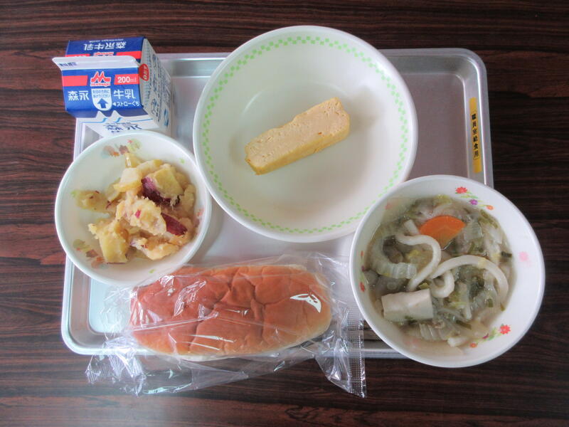 今日の献立は、ミルクパン、牛乳、さぬきうどん、さつまいもとりんごの重ね煮、厚焼きたまごでした。