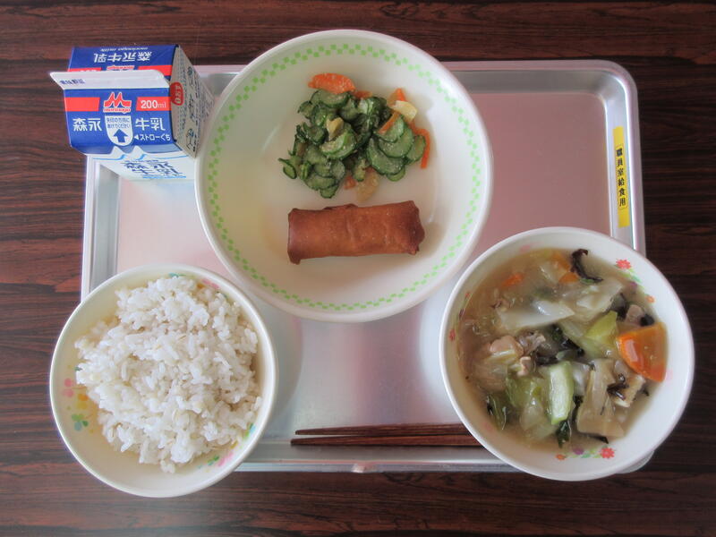 今日の献立は、麦ご飯、牛乳、八宝菜、春巻き、かりかりあえでした。