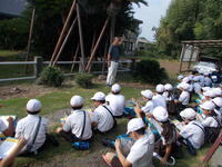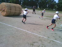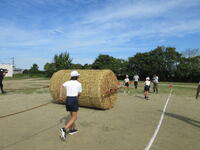 その後、運動場で、祭りで行われる俵ころがしレースを体験しました。