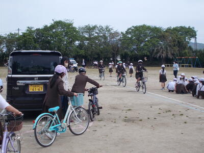 4名の指導員の方をお招きして、安全に関する話をしていただき、その後、運動場に作成したコースを使って、実際に歩行や自転車の練習を行いました。