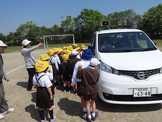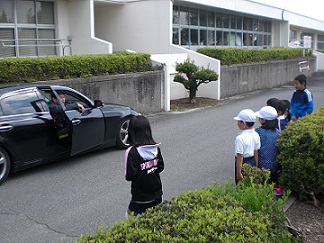 実際に学校敷地内に職員の車を入れ、車から声をかけられたときにどのように対応するか3つのパターンを練習しました。