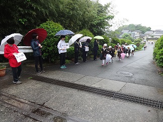 小雨の中のあいさつ運動となりましたが、保護者の皆様にご協力いただき、行うことができました。