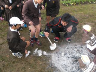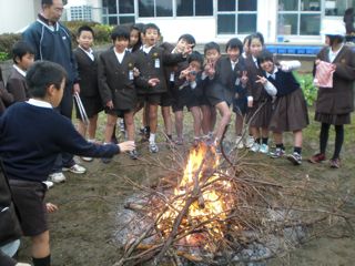 低学年教室前にある三角の畑でたき火をして、