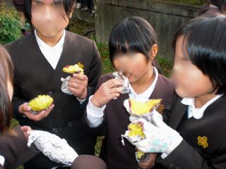 昨日は1・2年生が、今日は3・4年生が、学校で焼きイモをしました。