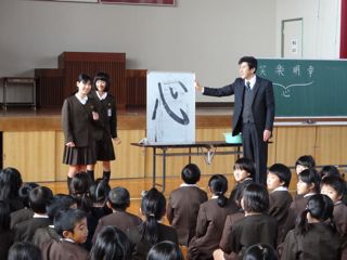 そこで、大野小の今年の漢字を「心」に決め、児童代表に筆で書いてもらいました。