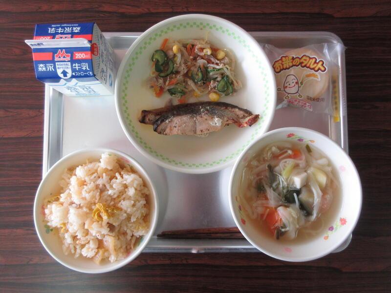 今日の献立は、キムタクご飯、牛乳、ふしそうめん汁、鮭のハーブ焼き、スタミナサラダ、お米タルトでした。