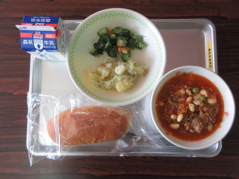 今日の献立は、コッペパン、牛乳、チリコンカン、チーズポテト、コロコロ野菜サラダでした。