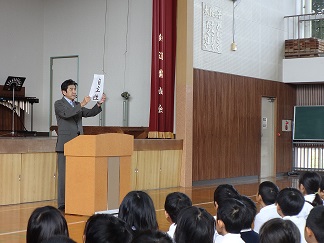 校長先生から3つの視点で、学校全体で頑張ってきたことの振り返りの話がありました。