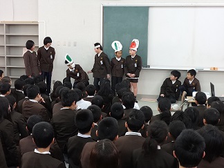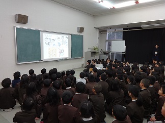音楽委員会の「みなさんは何の為に生まれてきたか、考えたことがありますか」という語りかけから集会が始まりました。