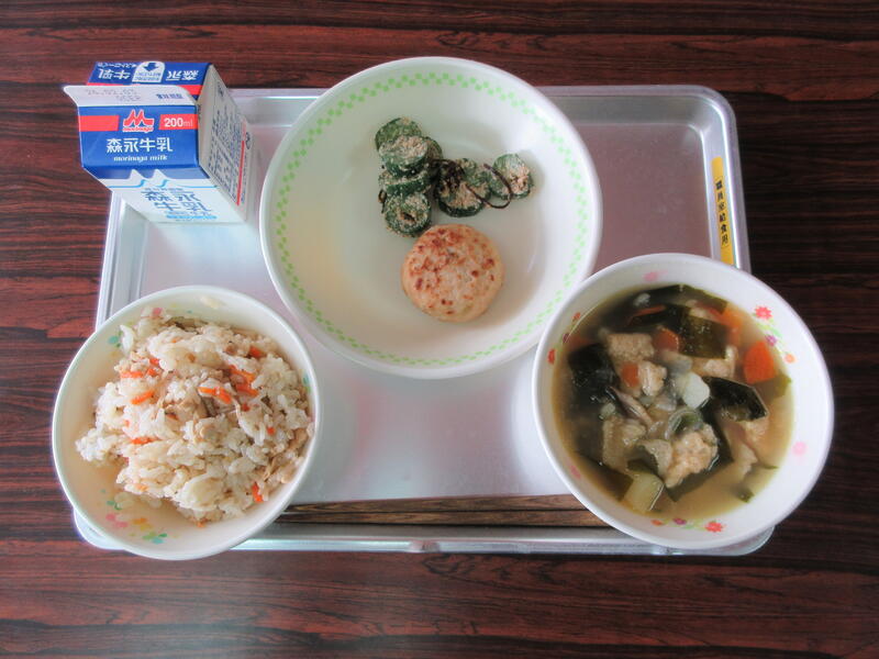 今日の献立は、びりんめし、牛乳、白玉汁、ごぼうきんぴらバーグ、ごまきゅうりでした。