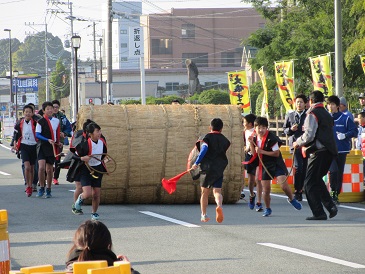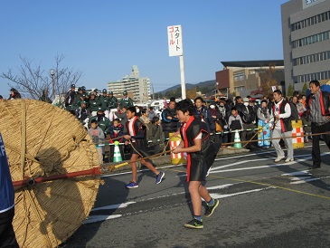 重さ1トンもある大きな俵をみんなの力を合わせて引っ張ります。