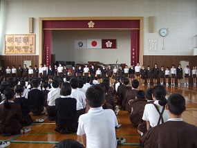 学校目標「郷土に誇りをもち、夢に向かって挑戦する」について話されました。