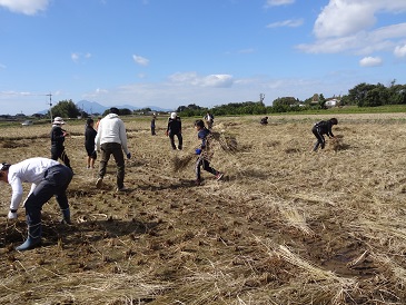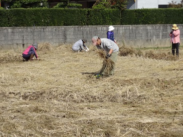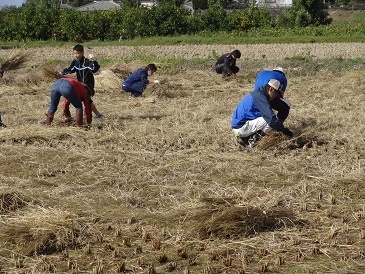 地域の方やPTA役員さんの協力で5年生が米を収穫した後のわらを束ねていきました。
